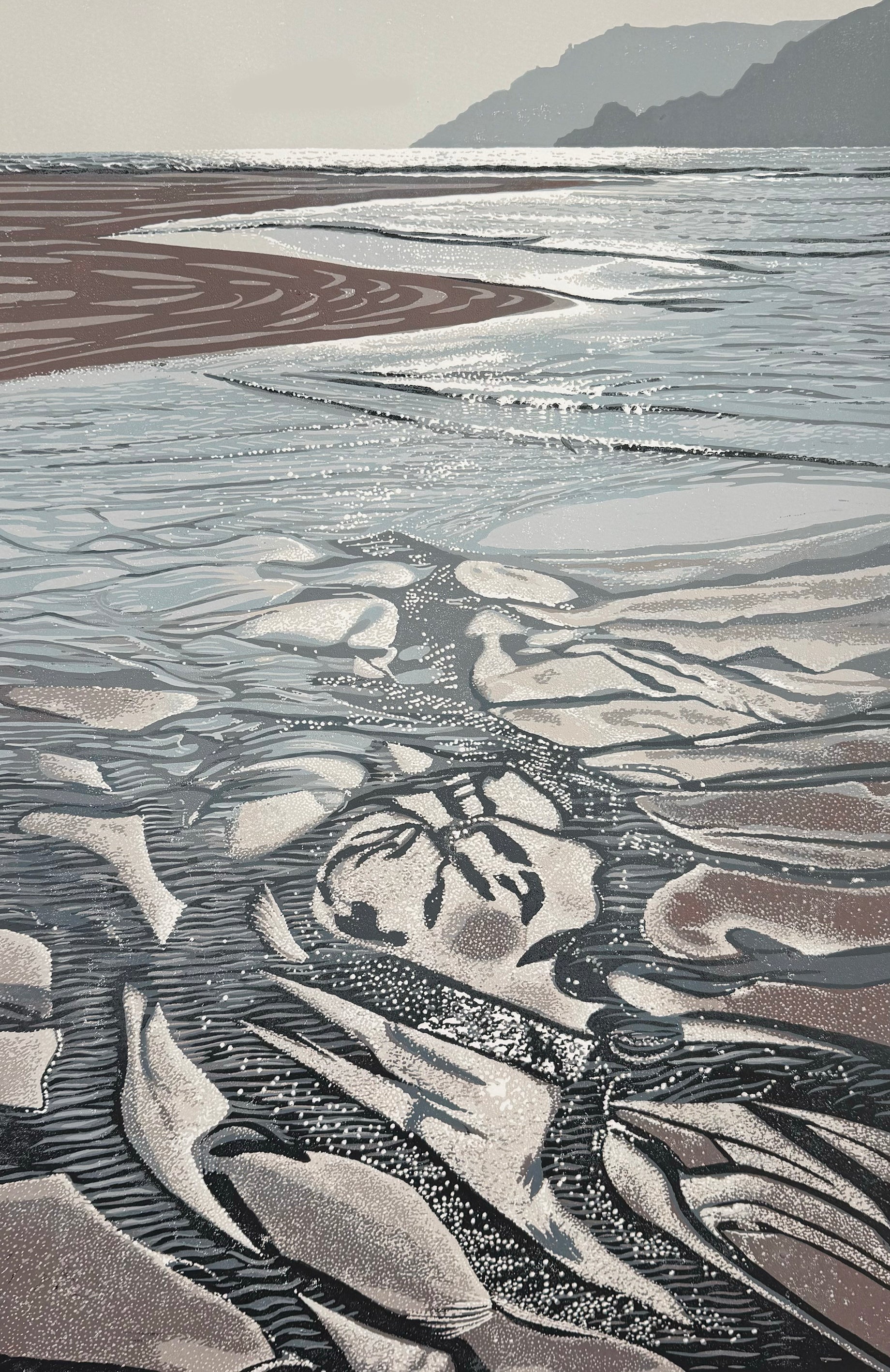 Shimmering low tide, water patterns left on the beach, your eyes drifting towards the horizon.